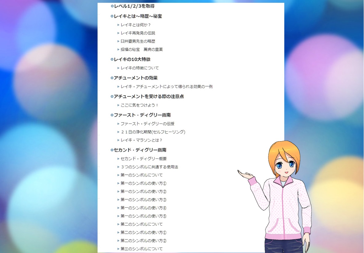 ある程度、レイキの知識がある方なら下記のメニューを見ればお分かり頂けると思いますが、必要な知識内容はすべて網羅しています。
